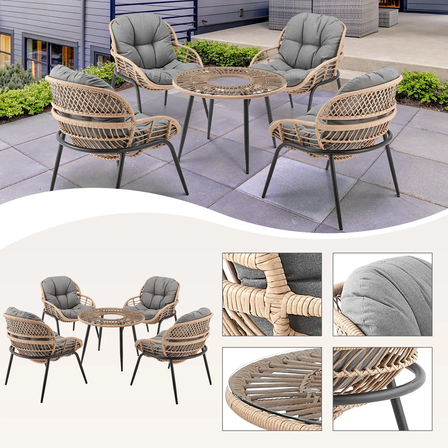 Neben dem stylishen und funktionalen Design sind die 5-teiligen Essenssets von E-shine außerdem unglaublich vielseitig. Das modulare Design ermöglicht es dir, die Teile nach Belieben umzustellen, um die perfekte Außensitzgruppe für jede Gelegenheit zu schaffen.