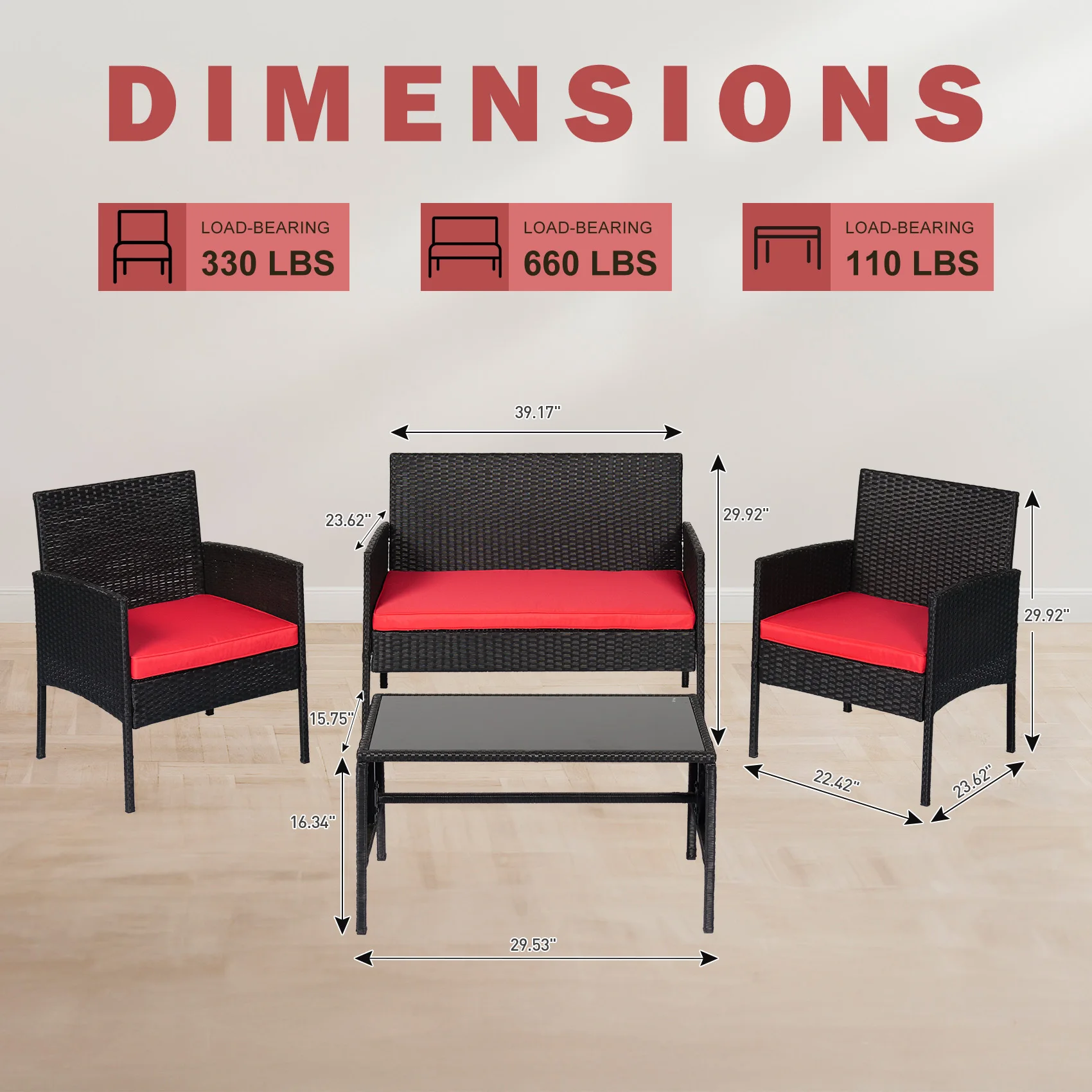 * Vielseitiges 4-teiliges Set umfasst roten Sitz, 2 Stühle und Glasoberflächen-Couchtisch zum Ausruhen und Unterhalten